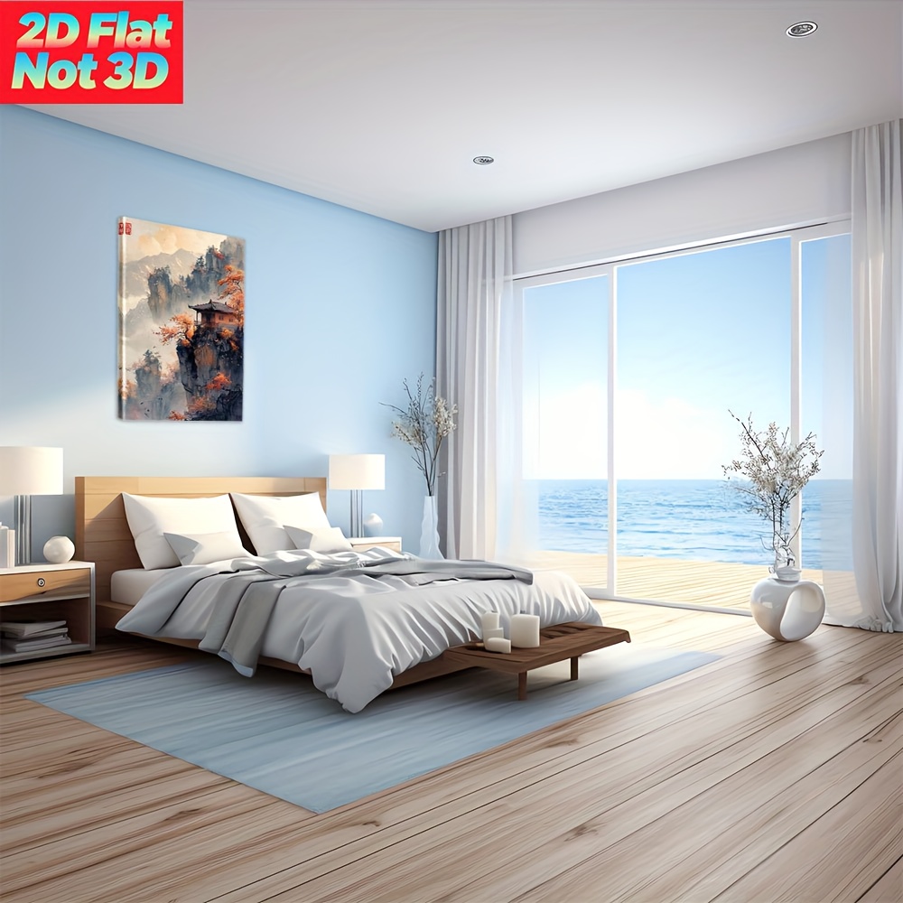 2D Flat, Chinese Mountain Landscape with Red Autumn Trees. Large Wooden Framed Wall Art Home Decor Canvas Painting- for Bedroom, Bathroom, Living Room, Office, Kitchen, Holiday Gift- 1pc, Canvas Wall Art Ready to Hang, Extra