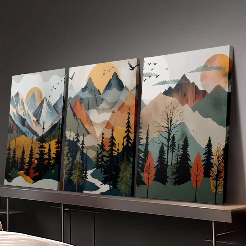 3 Framed Canvas Paintings And Posters, Ready to Hang, Including Frame, Abstract Mountain Forest Landscape Home Decor, Wall Art, Room Decor, HD Print, Holiday Gift, Living Room, Bedroom, Dining Room, Office Decor Painting with